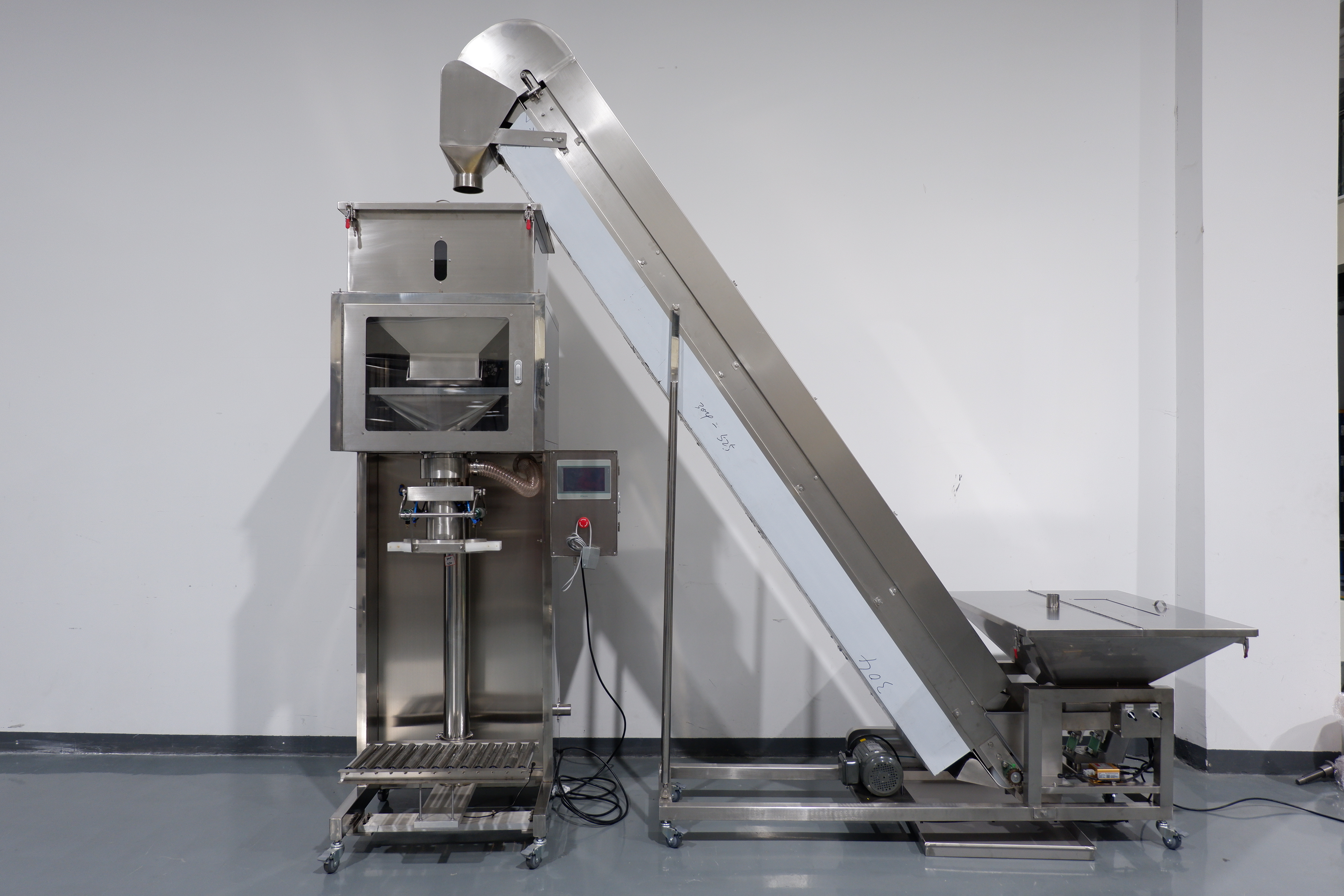After reaching the “fast weight”, self-flowing hopper is closed by cylinder and vibration hopper starts slow filling